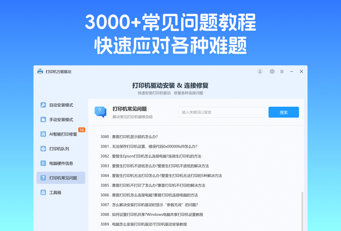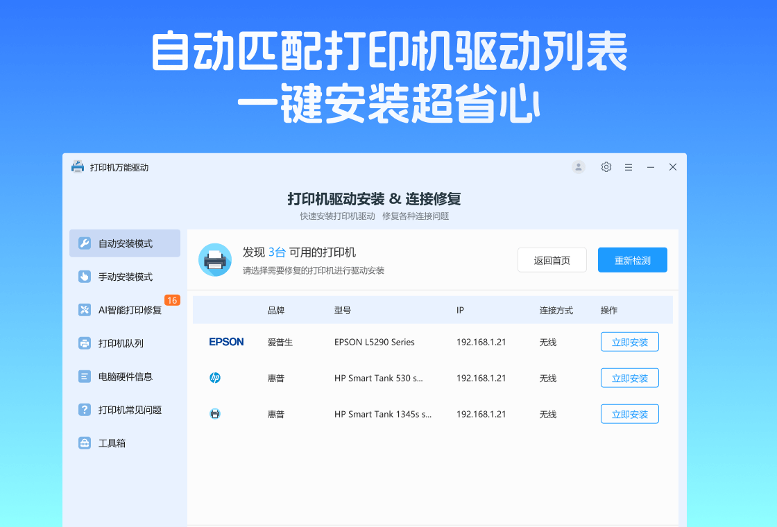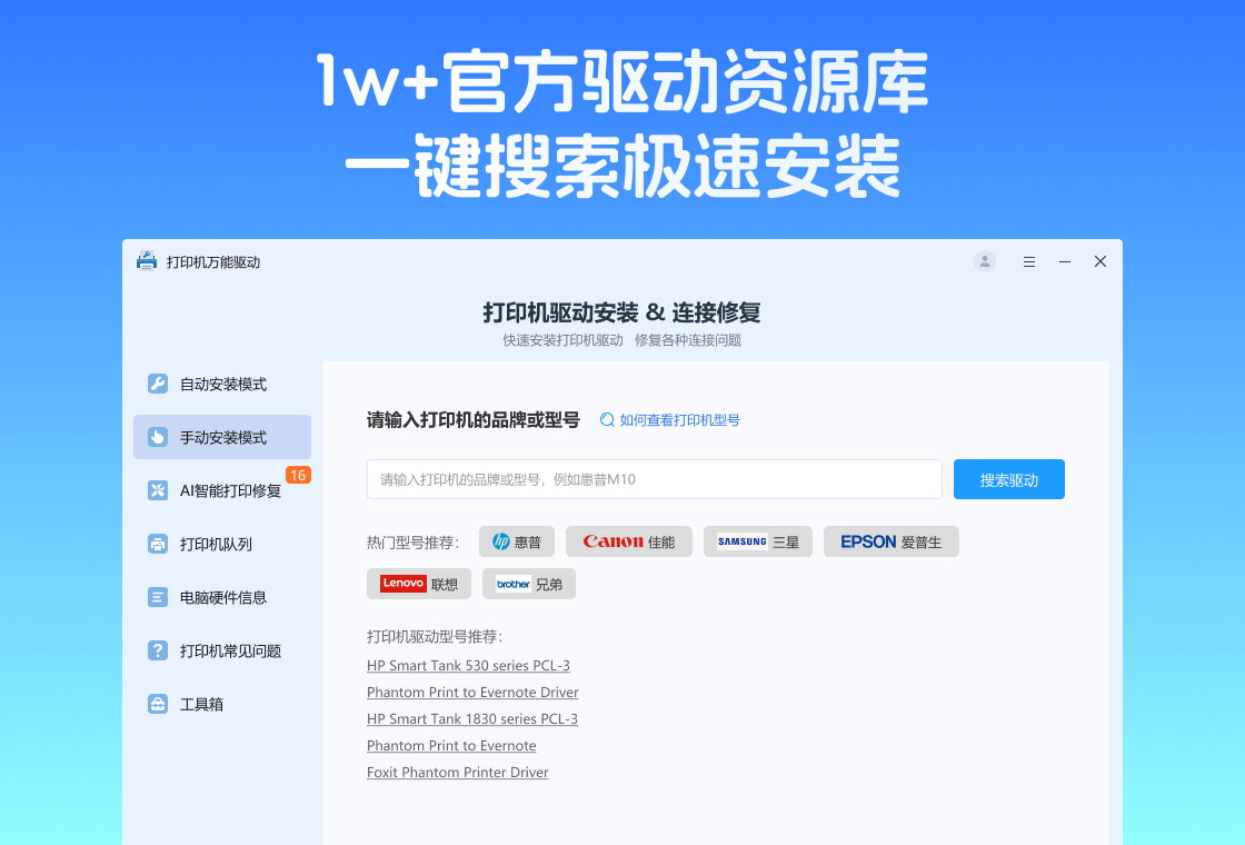 打印机驱动大师是一款能够自动识别打印机品牌:型号;一键修复驱动程序的软件该工具,专注解决打印机问题例如:打印机无法连接,驱动异常,打印出错等其它问题【自动识别品牌及型号】:打印机连接电脑局域网或使用USB线进行连接,打印机驱动大师将自动识别品牌,型号,进行匹配驱动【手动识别品牌及型号】:手动输入品牌+型号获取打印机驱动,进行下载安装【打印管理】:一个面板管理所有打印机的增删。【常见问题】:查看有关打印机常见问题包含“打印机驱动大师使用教程””“设置共亨打印机”“有线或无线连接打印机”